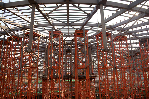 西安高新国际聚会中心项目由工具侧办公区钢结构、中空区聚会室钢结构、南北悬挑区钢结构三部分组成,结构系统为钢框架结构,用钢量达9000余t,屋盖大梁跨度达72m。